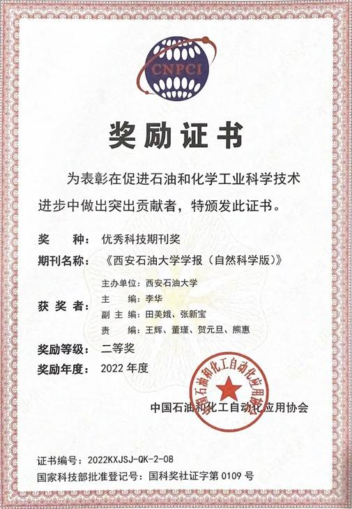 (3)《石油工业技术监督》在2018年获第五届陕西省优秀科技期刊奖、2020年获第六届陕西省特色科技期刊奖。